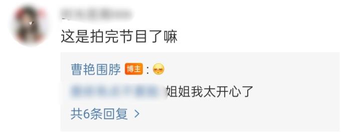 22日下午,《欢天喜地七仙女》中饰演六公主兰儿的演员曹艳在社交平台上发布了自己的定位,正好是在浙江杭州,也就是《王牌对王牌》的录制地点,在评论区也有网友询问“这是拍完节目了嘛”,曹艳则回复了一个害羞的表情,疑似回应确实在录节目。