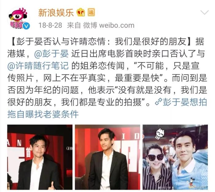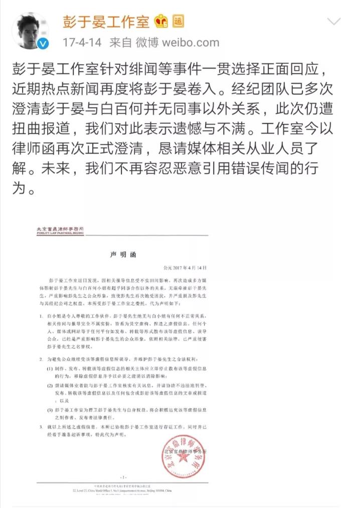2017年因拍摄《分手合约》与白百何被传绯闻,但后来彭于晏工作室以律师函澄清。