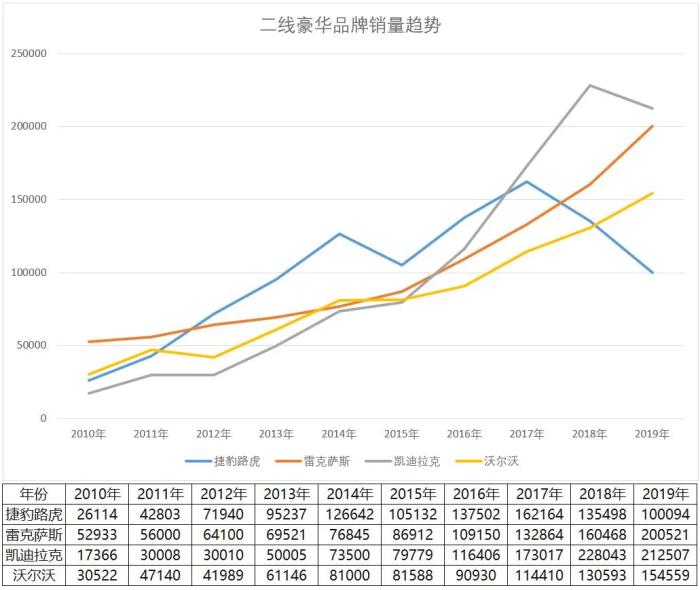 与此同时,以奔驰、宝马和奥迪为首的德系豪华品牌,接连突破70万辆的销量。二线豪华品牌中,凯迪拉克和雷克萨斯相继突破20万辆,沃尔沃突破15万辆。曾经落后于捷豹路虎的凯迪拉克、雷克萨斯和沃尔沃相继完成对捷豹路虎的反超,并且差距越拉越大。