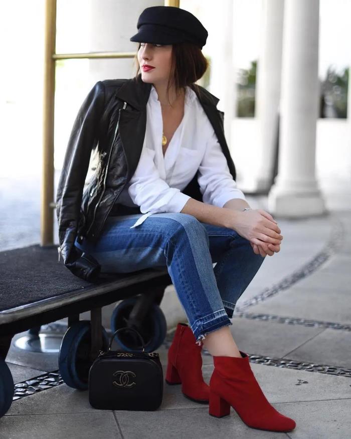 深蓝牛仔裤+黑色皮衣+白衬衫+红靴,经典的牛仔裤配色法,沉稳中有热情,低调还张扬,轻奢还高级。