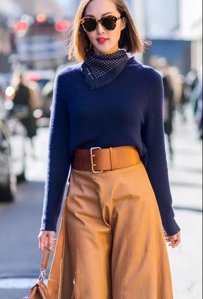深蓝色毛衣,优雅迷人。用一条卡其阔腿裤搭配它,你想要的的时髦高级全都有!