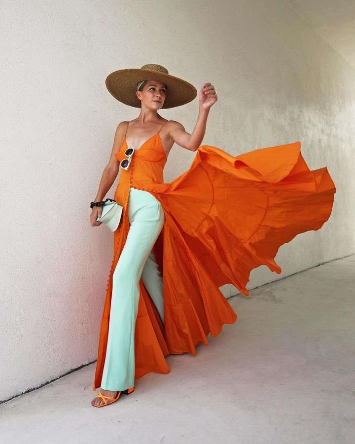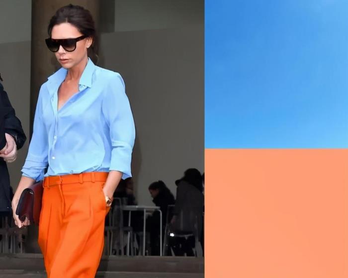 蓝色配橙色,非常考验对色彩的运用力。这一对颜色配合,一冷一热,往往不讨巧。没有强大气场穿不出相应的气势。