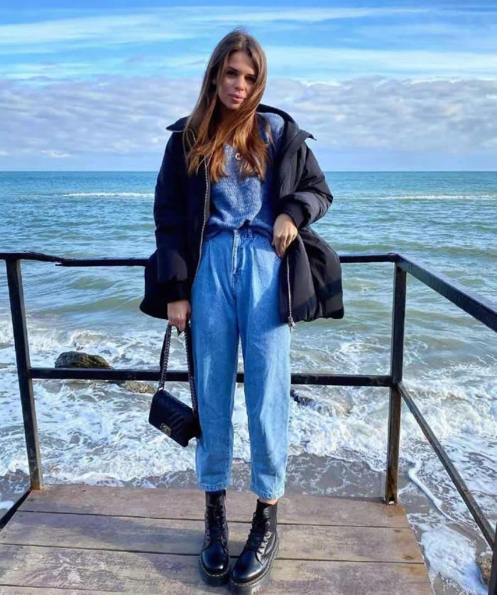 黑色羽绒服,内搭蓝色一体色,简单日常不易出错。但这类配色想要更好看,请用亮色包包或靴子,或帽子、或夸张的首饰。