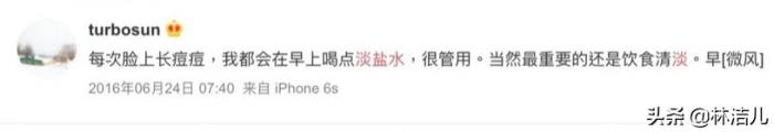 针对长痘痘问题,孙俪说这代表肌肤缺水,所以她会在这期间,每天早上喝杯淡盐水,很有效。当然最重要的,还是要饮食清淡。