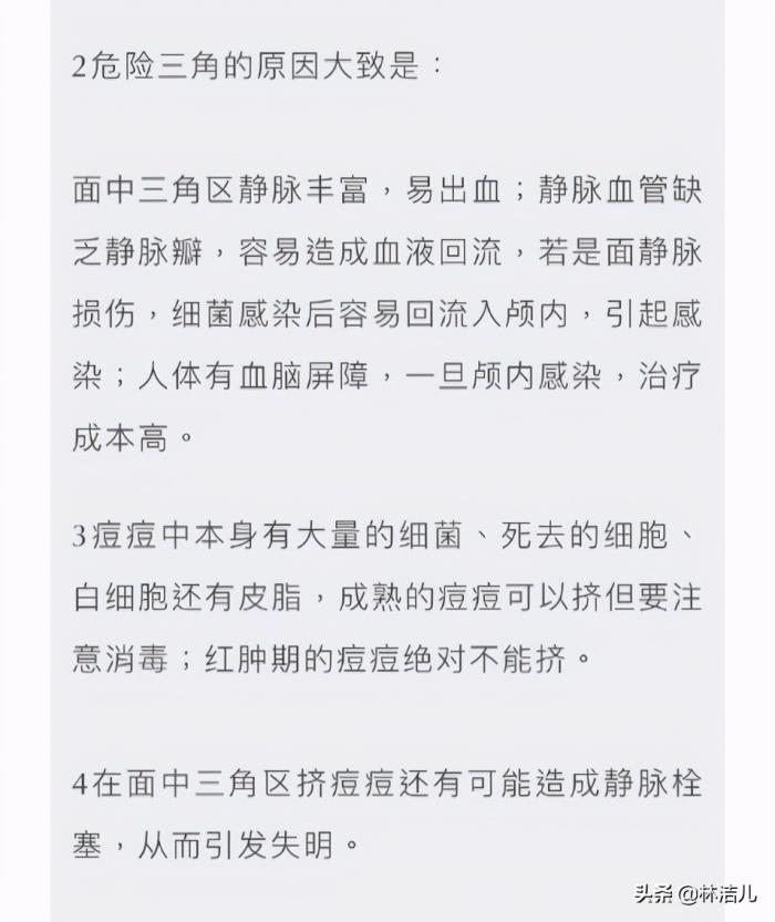 这还真不是夸张,因为他挤的正好是面部“危险三角区”的痘痘,这个面部的区域估计很多小仙女们都听过。
