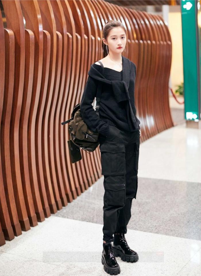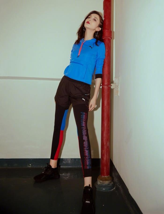 古力娜扎就曾用蓝色卫衣搭配黑色裤子。这就是彩色上衣+黑色裤装的优点了。
