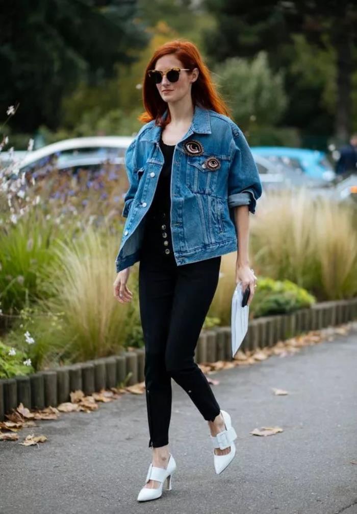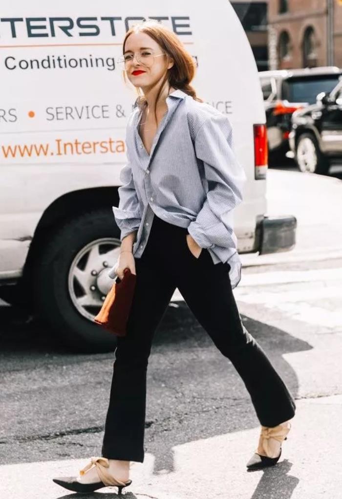 如果腿型不错,可以尝试偏瘦的黑色裤子,上衣穿着宽松的衬衫,脚上踩着小猫跟尖头鞋,慵懒又带点小性感,很法式。