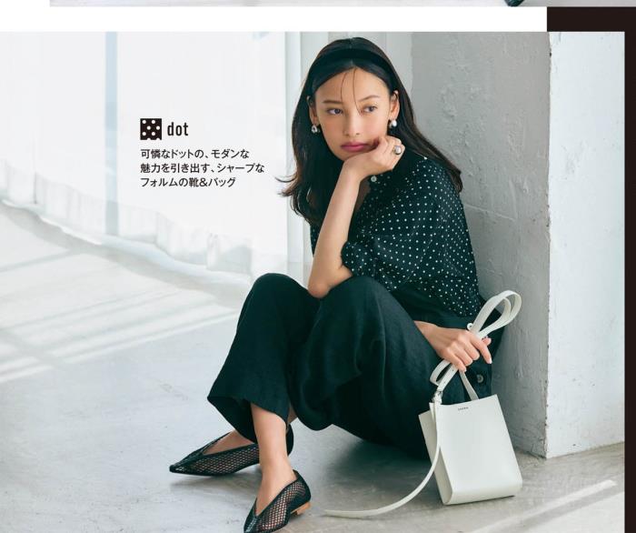 比如简洁的黑色裤子,搭配了黑色底+白色的小波点图案,有点精致又有点成熟,鞋子选择了网格材质,一双简单的尖头鞋,让黑色的穿搭从优雅过渡到时髦。