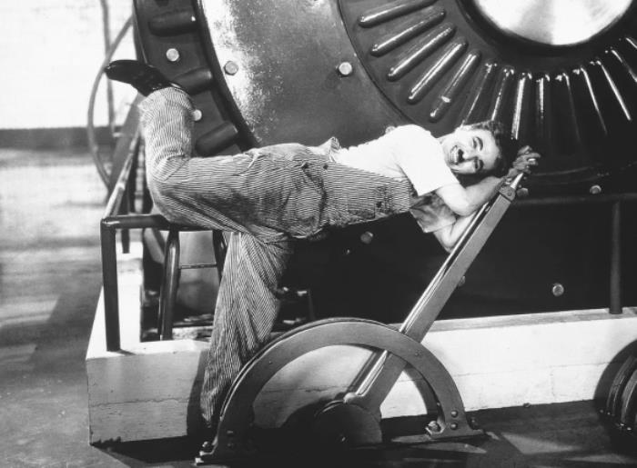 故事发生在上个世纪的二十到三十年代,正值美国的经济大萧条时期,失业率高居不下,工业也受尽压榨。而我们的主角查理作为一个底层市民,更是如此。他的工作是拧紧六角螺帽,挣扎在生产线上的查理最后眼中只剩下了六角螺帽,只要是六角形的他就想拧一下。即便如此,老板还是嫌弃不够,他嫌弃工人吃饭占用的时间太长而引用了吃饭机器。吃饭机器在开始后不会停止,让查理几近疯狂。