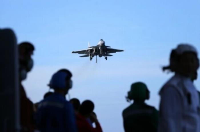 歼-15舰载战斗机即将阻拦着舰。李唐/摄
