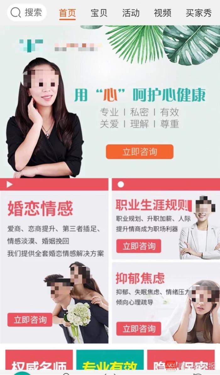 南都记者在该店主页看到,其提供婚姻挽救、爱情挽回、抑郁焦虑、职业规划、人际关系提升、性心理等多种服务。在情感咨询服务中,卖家介绍,可提供“异性代追”、“异性代聊”、“爱情挽回”、“婚姻修复”、“分离小三”等全套情感解决方案。