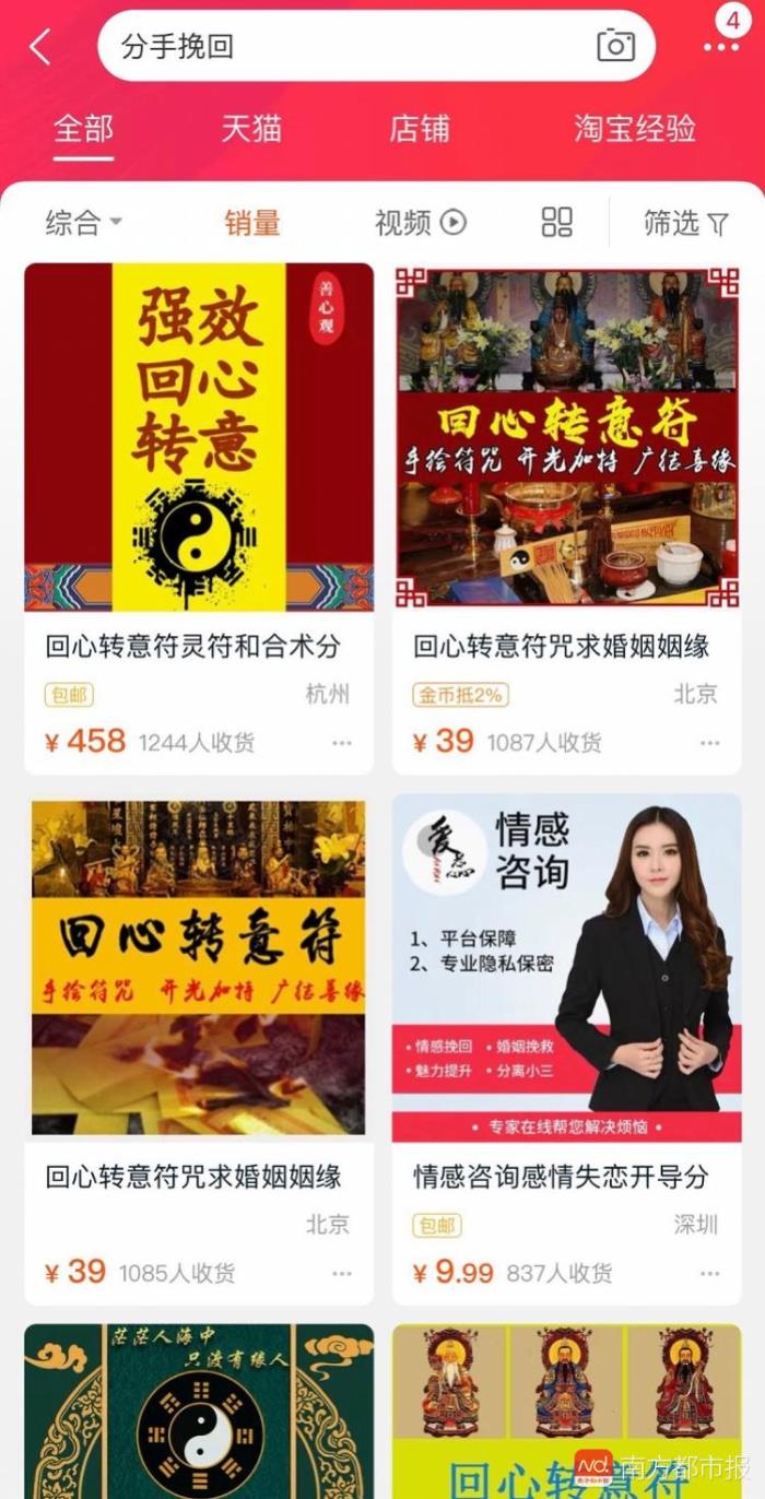 除了提供“分手挽回”“小三劝退”“婚姻挽救”等“情感咨询”服务外,电商平台上还充斥着各种公然售卖“回心转意符”“勾魂符”等的店铺,有的宣称“按命理写符”,“3日起效,28天复合。”