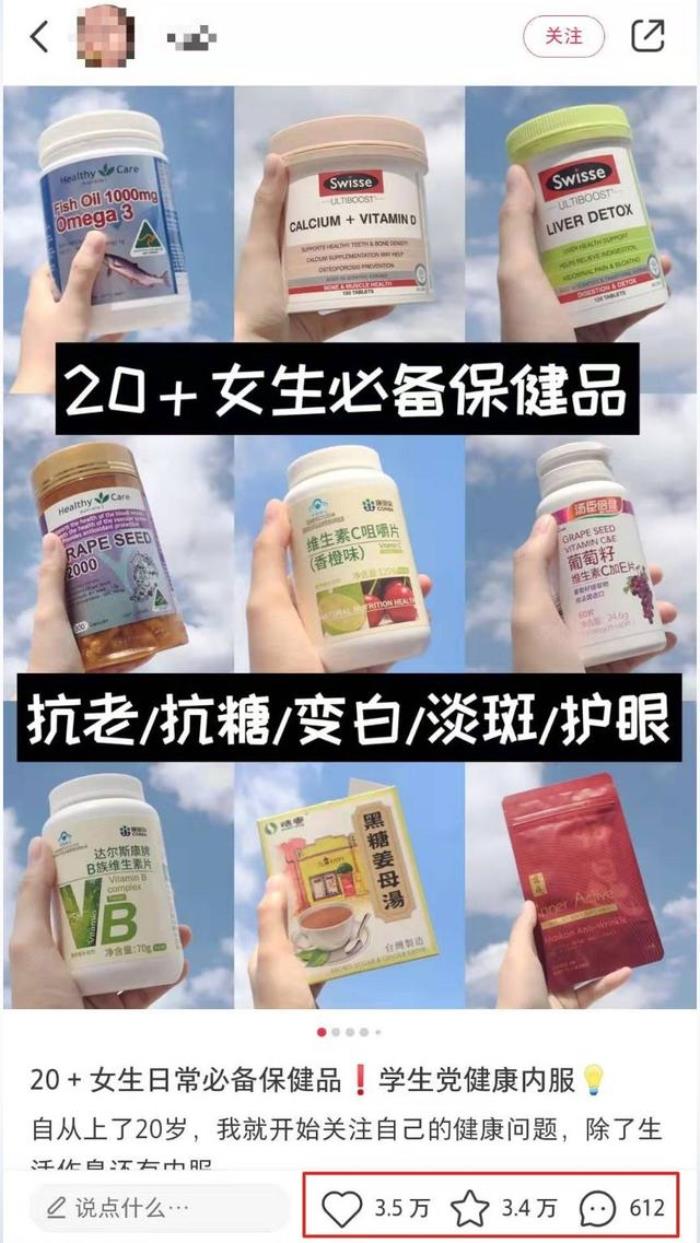 钙片长高、鱼肝油提视力、抗糖丸祛痘等等,功效全部瞎编,博主只是把20多岁女生恐慌的点拿出来随便用保健品套一套,就能骗到这么多点赞和收藏。并且,这样的笔记在小红书并不占少数,全是换汤不换药。