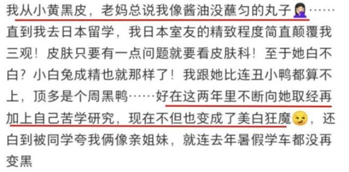 用美白的一篇举个例子,故事的设定状况是:女生从小被妈妈说黑,到日本留学认识了一个巨白的室友,向她学习了美白技巧,号称天生的黄黑皮都能有用。