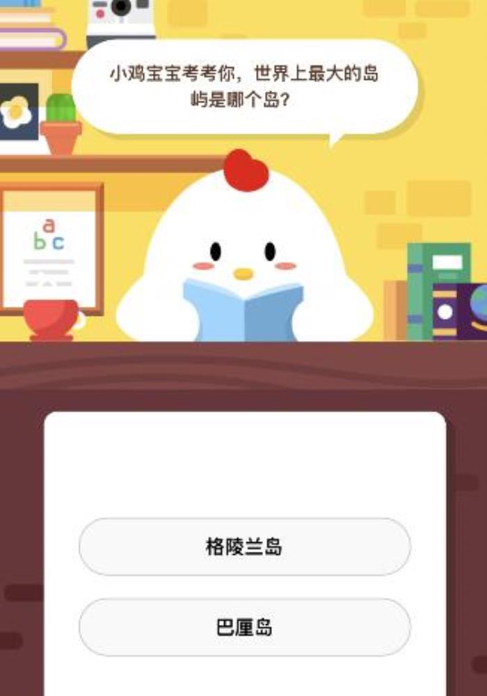 小鸡宝宝考考你,世界上最大的岛屿是哪个岛?这是蚂蚁庄园11月29号今日庄园小课堂的问题,很多用户还不知道答案,本文小编会为大家详细介绍,感兴趣的小伙伴们,一起和小编来看看吧!