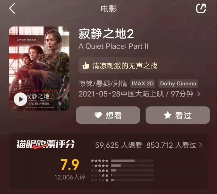 5月29日,根据猫眼数据显示,电影《寂静之地2》猫眼开分是7.9分,看过本片的网友对电影的评价也是不俗。