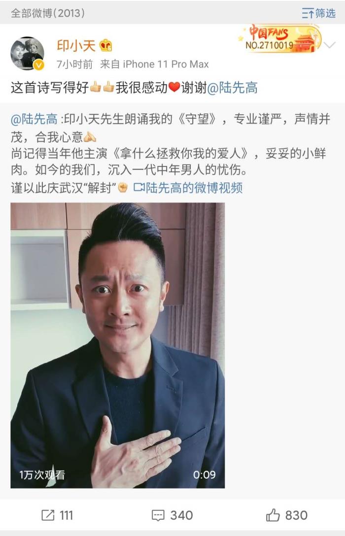4月13日,演员印小天转发了一条自己朗读诗歌《守望》的微博,丰富的表情、雄浑的嗓音、充沛的感情又引起了一波“回忆杀”!