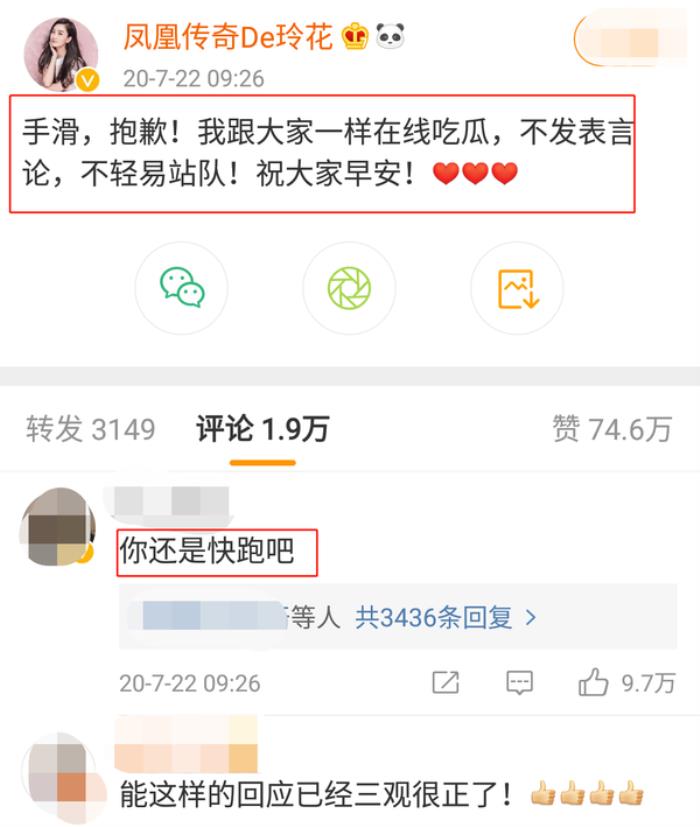 而当时玲花还不小心点赞了一条认为老公有错的文章,后来又发文称自己是手滑,并说自己也是在吃瓜,不站队,当时网友还劝她快跑。
