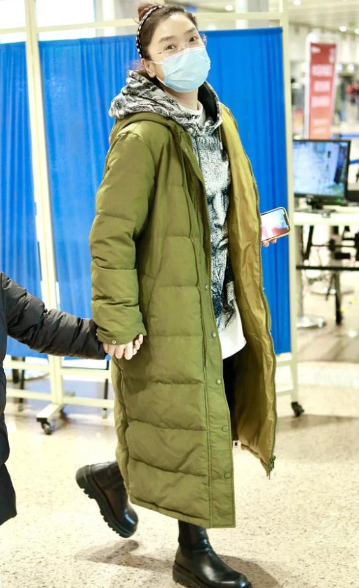 从图片中可以看出,玲花扎着丸子头、戴着眼镜,身穿一件军绿色的长款棉服,脚上穿着一双马丁靴,看起来很是随意。