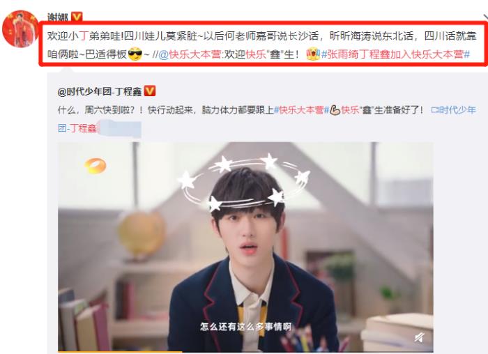 谢娜转发为丁程鑫打call,更是直言以后要和弟弟一起说四川话,想想也是让人十分激动的,丁程鑫是时代少年团的成员,人气非常高,之前就被曝丁程鑫将加盟快本的节目。