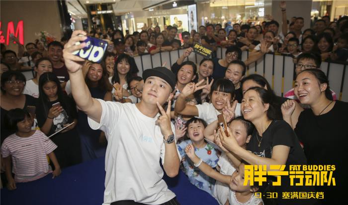 无锡路演现场,导演包贝尔一出现便引发了阵阵尖叫与欢呼。对此,包导热情回应,拿起手机与现场观众玩起自拍,亲密合影留念。在互动环节,导演包贝尔大方分享“胖妆”体验,直言“非常辛苦”、“胖妆造型持续了一个星期之后,脸就开始持续溃烂”。虽然“胖妆”十分艰辛,但包导也表示只要能够给大家带来欢乐,这一切就很值得。