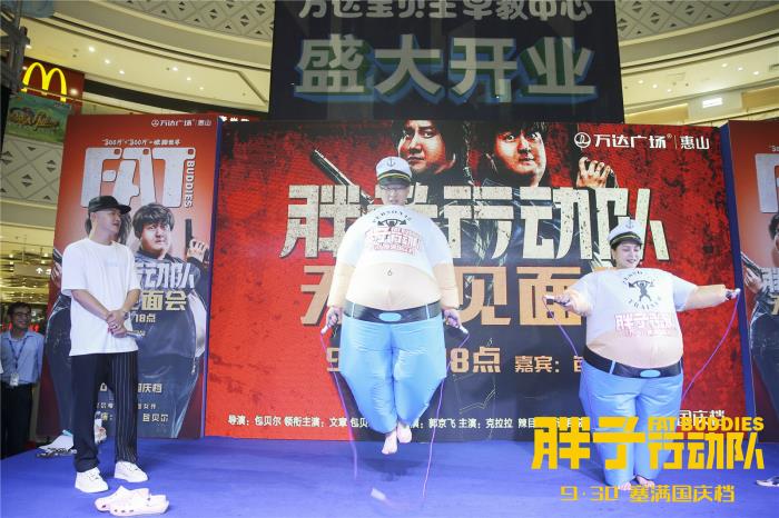 电影中,文章和包贝尔饰演两位超灵活的胖子特工。导演包贝尔也在现场邀请观众一起体验了一回做胖子特工的感觉。两位观众被邀请上台穿上胖装,面对导演包贝尔提出的特工必备素质——聪明、机灵、行动力时,毫不退缩,直言“都符合”。在两人的努力之下,最终成功完成了考验特工“行动力”的体力挑战。