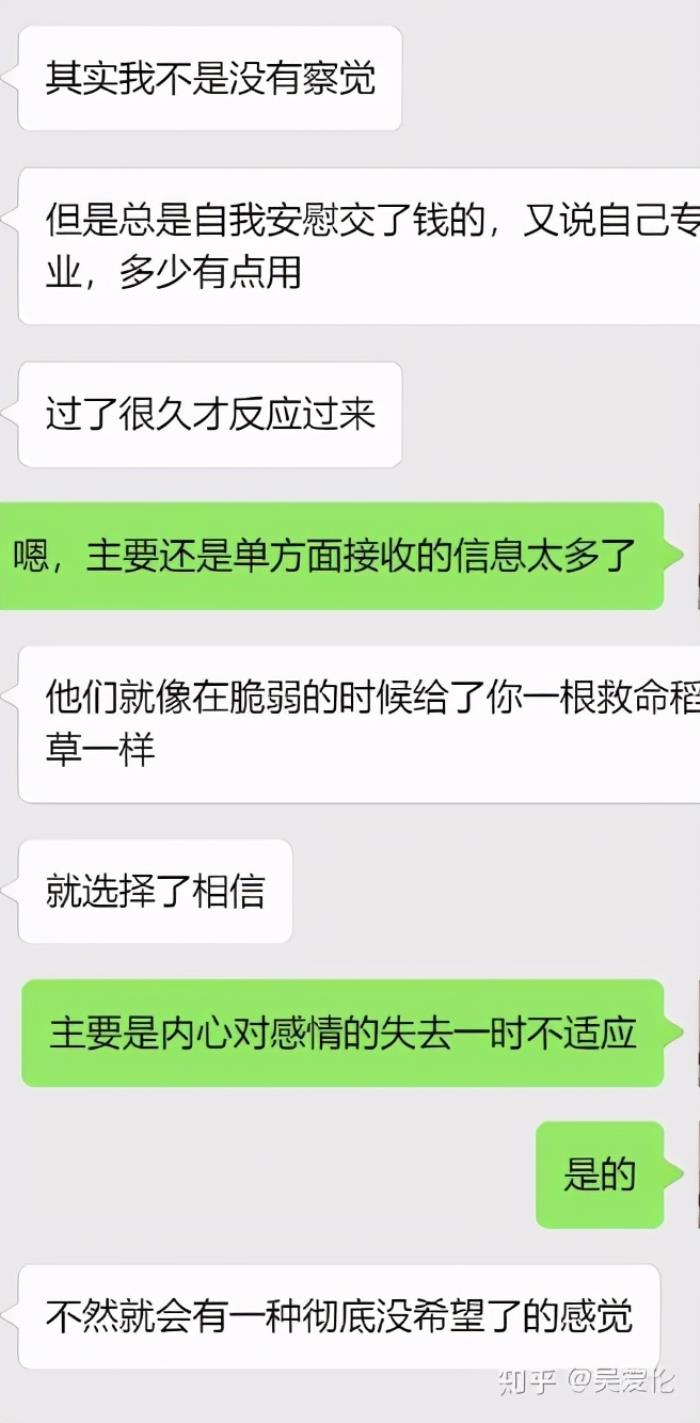 那时我深陷情绪中,整个儿空心人似的,整天就在宿舍打游戏,偶尔浑浑噩噩乱逛网页,就发现了一家情感挽回机构,只是需要付6千多,作为学生党的我没多想,只要她能回来,无论付出什么,我都愿意。之前在一家心理医疗诊所兼职,加上家里的生活费,其实还是有点闲钱的,只是泡酒吧又花得差不多。我就跟朋友借,东拼西凑交了钱。加了好友后看他朋友圈的一些指导记录,成功率还挺高,连小三都能赶走,而且保证电话、微信跟踪指导,无限沟通,一开始还说的上几句帮我分析,交钱后发了一堆课程给我,后来就不怎么回我,问就是学员太多,在忙,总共没几次咨询,每次都说不上几句,半天才回复,晚上完全玩消失。后来我不耐烦了,骂了他们一顿删除了。