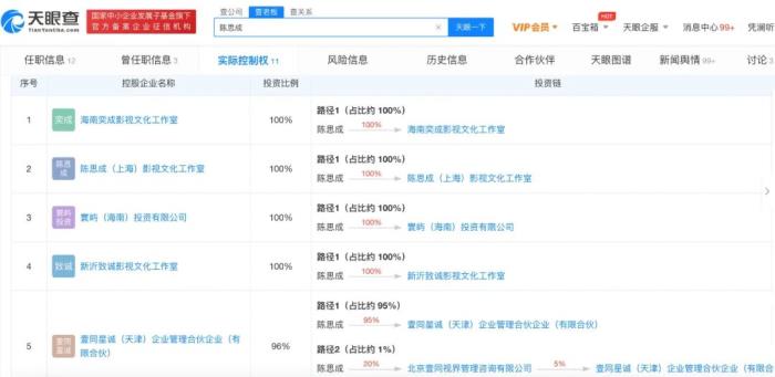 陈思诚实控11家公司,在他的商业版图里,与其关联最多的是他的父亲陈胜奇,并非佟丽娅。陈胜奇关联企业共8家,包括北京壹同视界管理咨询有限公司、上海壹同影视制作有限公司、屿胜(海南)企业管理有限公司、寰屿(海南)投资有限公司等。