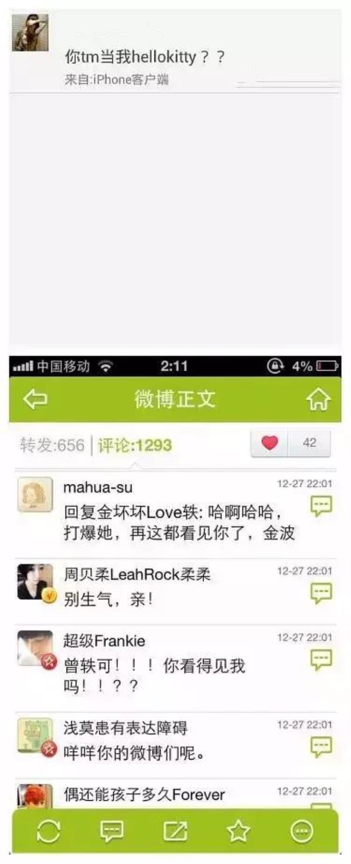 后来在14年刘亦菲生日,之前曾轶可弃博好几个月了,就上线借了三个好友的号发博祝刘亦菲生日快乐。