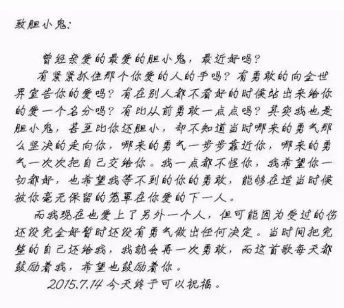 不过等到了15年7月曾轶可发新歌《胆小鬼》,她又顺便写了一封信,现在看来仿佛就是写给8月和宋承宪公开恋情的刘亦菲的信。