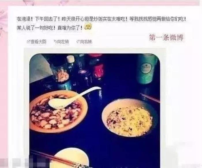 而后刘亦菲在微博更新的内容都是“甜蜜日常”,说自己做的饭难吃,但某人说了好吃而且还吃完了。