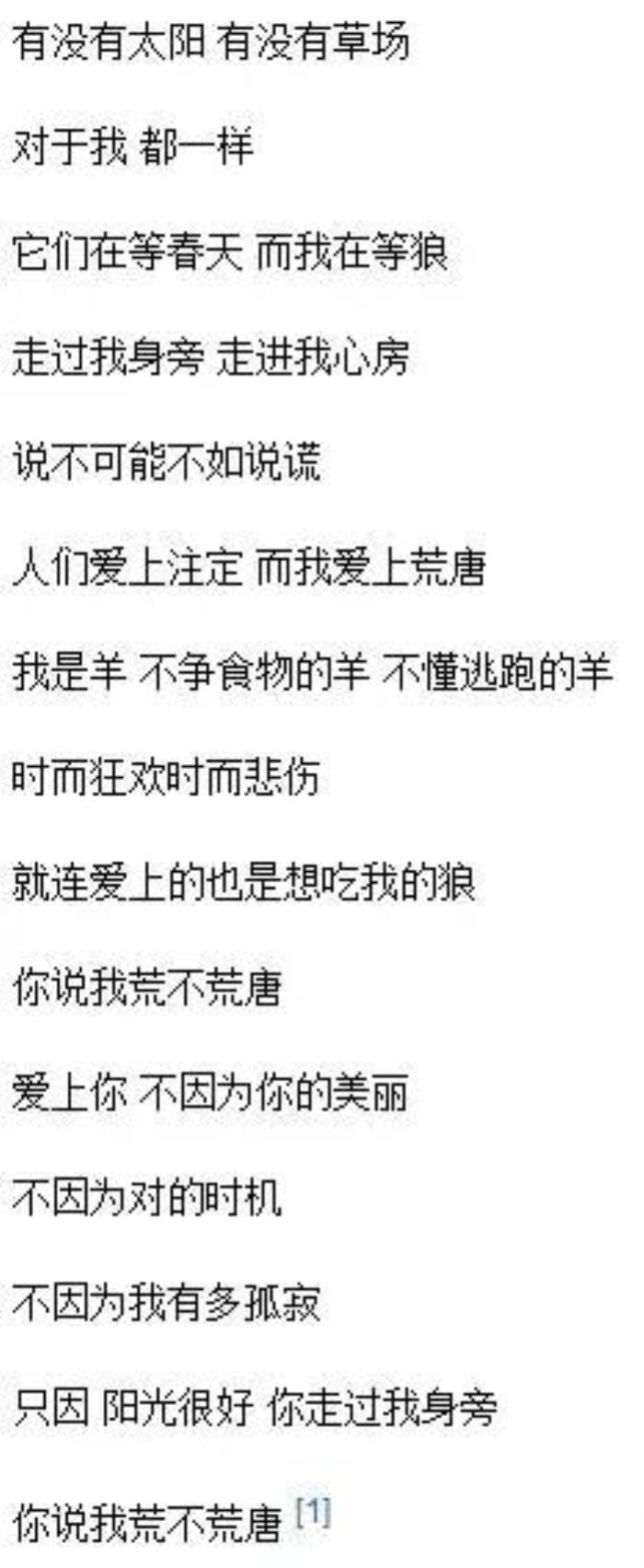 所以她肯定会给刘亦菲写歌来的,那段时间她就有这么一首歌叫做《荒唐的羊》,歌词是这样的。