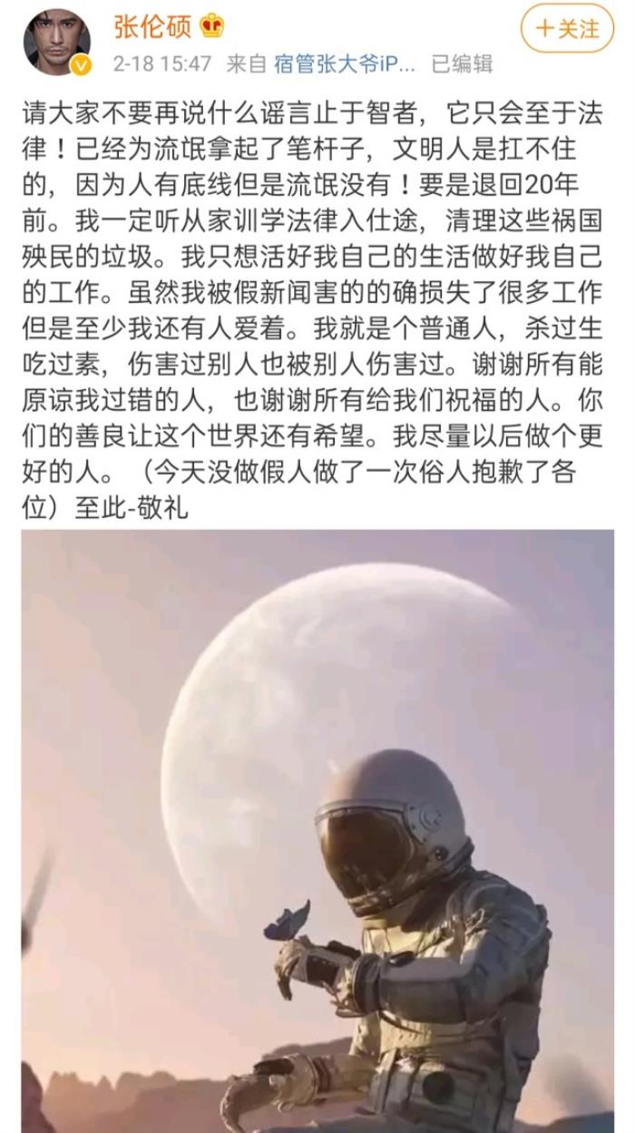 2月18日15点,张伦硕接连更新两条状态,怒怼造谣者:你就是个人渣!假新闻害我损失很多工作,我骂爽了,我老婆也爽了,我代表我们这个家庭臭骂你这个垃圾!