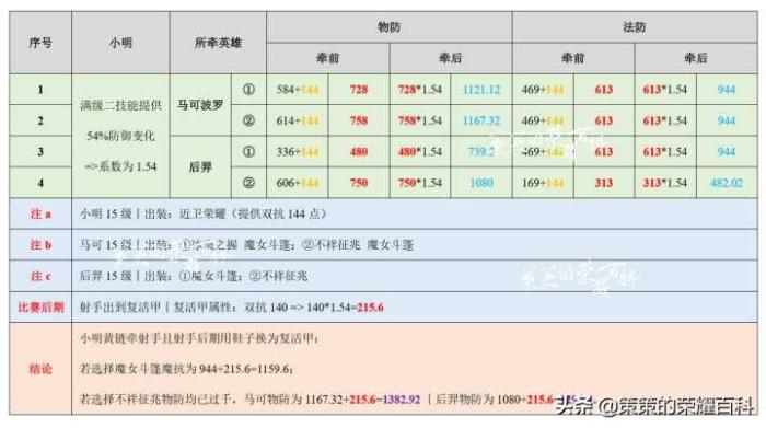 这样小明在牵射手转黄链时射手双抗可以达到1000以上,射手十五级后期用鞋子换为复活甲后,若选择魔女斗篷魔抗为1159.6;若选择不祥征兆物防也均已过千,马可物防为1382.92丨后羿物防为1295.6。