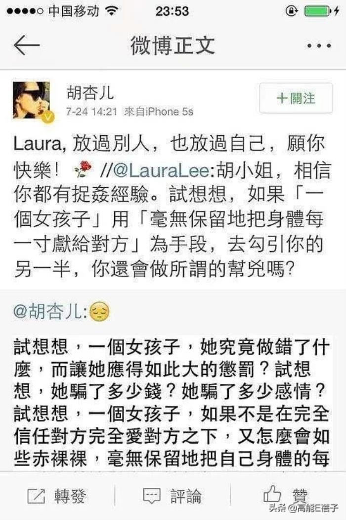 2013年TVB艺人马赛爆出不雅视频,胡杏儿为马赛说话,马赛的情敌Laura还直接揭露:“胡小姐,相信你都有捉奸经验。”