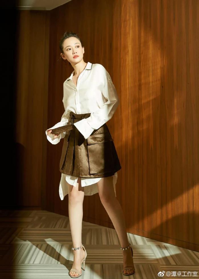 衬衫裙本来就是一个干净清爽的单品,但是纯白的话会让造型很容易显得“寡淡无味”,所以谭卓配上了一天棕色的皮裙,整个人看上去焕发青春活力,再配上细跟鞋,会让整体造型看上去更有纤细美感,值得注意的是高腰皮裙很好地分割了上下身,让双腿看上去更修长。