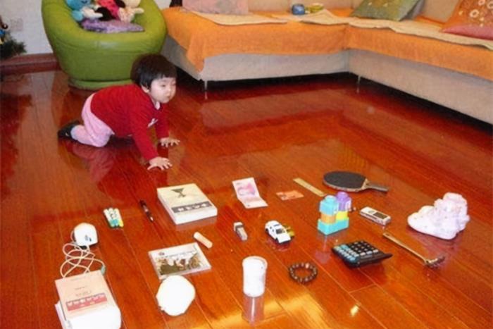 3.接着让宝宝坐在桌子中央,让宝宝任意抓取一件,抓两次即可,以此预测宝宝将来会选择的行业与命运。