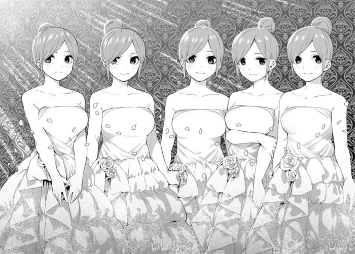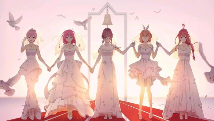 不过在最后的婚礼中却发现,绕了一大圈最后还是成为了后宫!在婚礼上,五胞胎姐妹都为风太郎穿上了婚纱,就像之前很多粉丝调侃的那样,反正五姐妹长得都一样,结婚时派一个代表出去拜堂,然后洞房时五人一起……咳咳,当然,这只是五姐妹的恶作剧,想在婚礼前再难为一下风太郎。