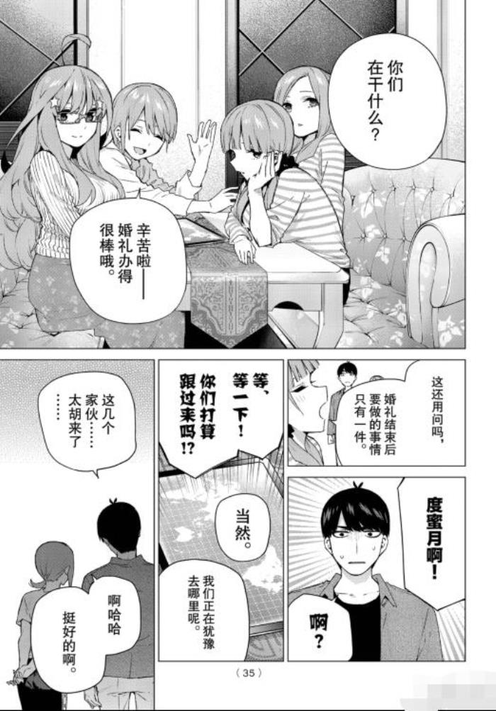 要是风太郎真的还是分不清五胞胎的话,ACG次元饭君真的要怀疑晚上洞房是不是四叶了。原本以为恶作剧就到此结束了,但是这只是开始。大家都知道结婚之后肯定是要度蜜月的,而到了这里,蜜月居然变成了五姐妹一起的事情,另外四姐妹居然还一起研究讨论起了蜜月要去哪里的问题,更是直接表示要跟着一起去。