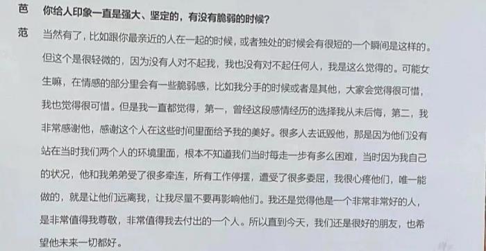 她还在采访中首次为李晨正名,她表示李晨真的是一个非常非常好的人,不后悔爱过,甚至自己非常感谢他曾给予过的美好,直到现在,两人也是很好的朋友。