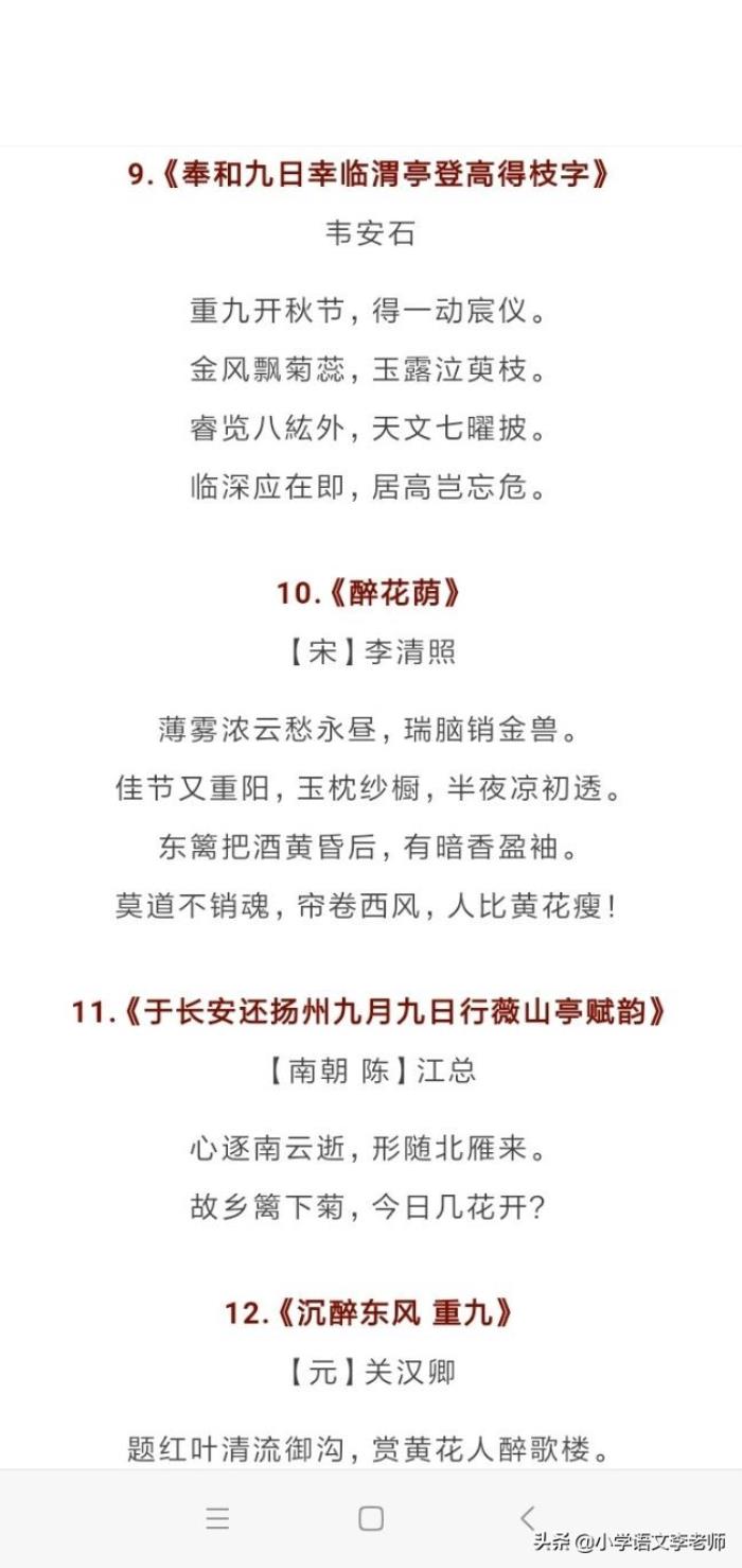 今天,李老师带来了一些有关重阳节的古诗词,建议各位家长收藏起来,让孩子加强积累背诵,从传统文化中汲取精神营养,做一个品学兼优的学生。