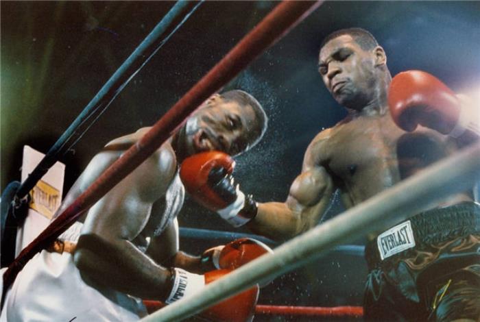 下图是泰森早期刚进军职业时的照片,从对手的面部表情就能看出他们当时有多痛苦,图2是泰森1986年面对“詹姆斯-蒂利斯”,面对巅峰的泰森蒂利斯被打的非常惨,事后他还回忆在被泰森重拳击中后,整个脸都歪了,当时感觉整个面部的骨头和下巴都碎了,就像被一个铁锤砸中了一样,这也是当时很多拳击手都惧怕泰森的原因。