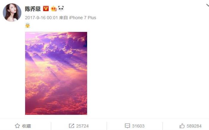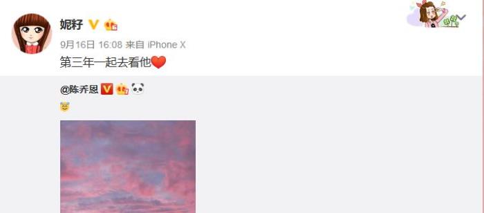 除了9月16日当天一大早,陈乔恩在微博发了一张粉色天空的照片,这是她纪念好友的仪式。每年的这一天,她都会发一张粉色的天空,表达自己对乔任梁的怀念。