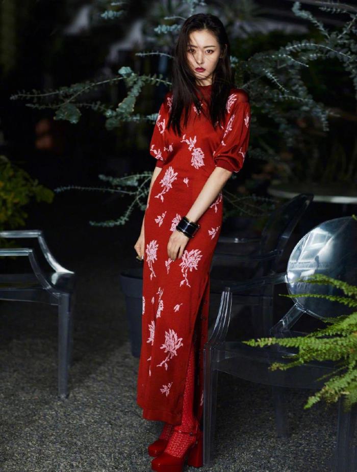 如果说上一张照片中的张天爱所展示出来的是静美女子气息的话,那么这张照片中身穿连衣长裙的她,则看起来就像一枚当代知性女人一样,这一袭红色长裙搭配着红色丝袜以及红色粗跟鞋,看起来一点不失淡雅气质。