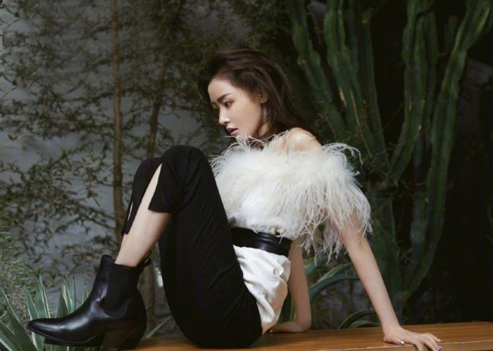 这张照片中张天爱身穿的衣服和她在上一张照片中的一模一样,不过这张照片拍摄的是全身照,从这个角度上我们可以看到,她上半身穿了一条一字肩羽毛裙,腰间围扎着一条黑色腰带,和她下半身搭配的黑色切割七分裤非常般配。