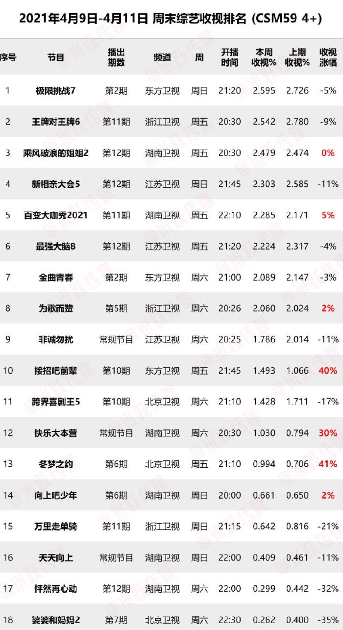 如今,关于上周末综艺收视率正式出炉,这次总共有十二档节目突破1%,八档破2%,虽然表面上看跟上一周基本持平,但整体数据还是有明显的下滑,接下来就一起看看这一次前五名都有哪些综艺吧!