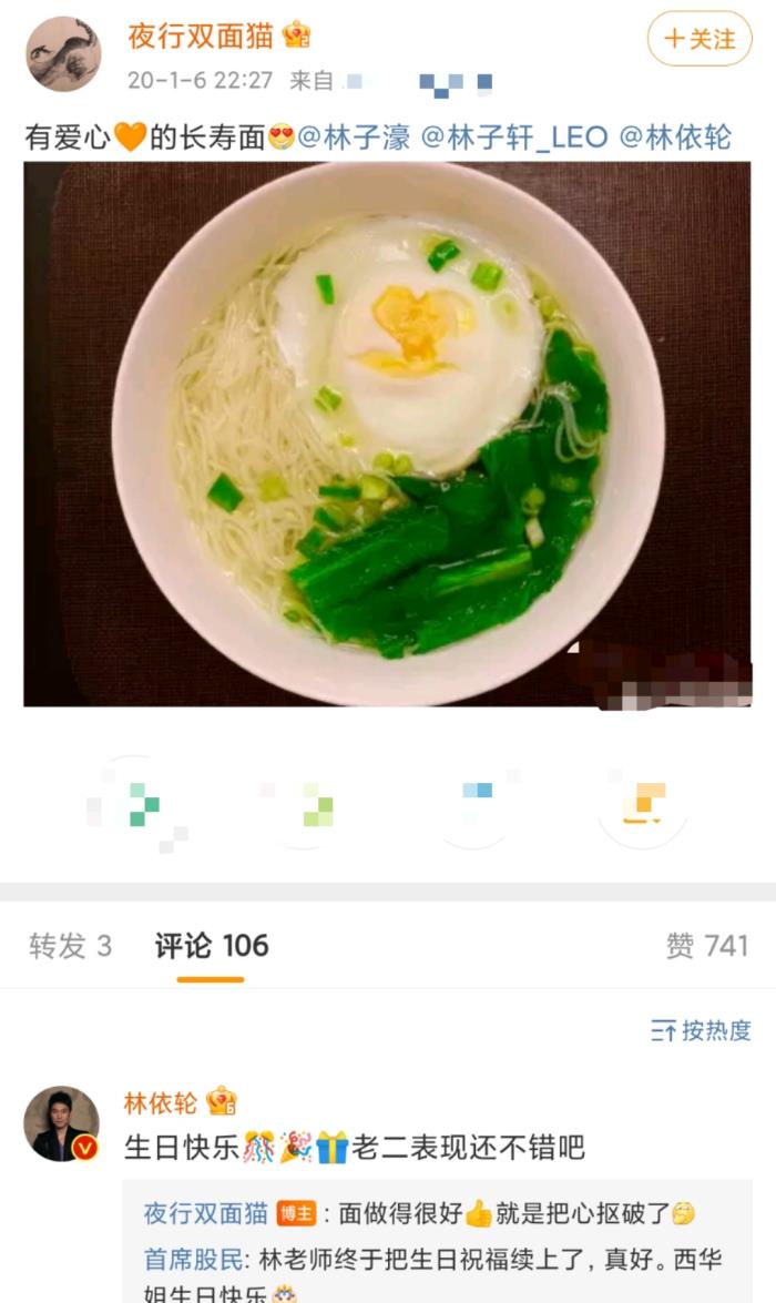 西华还曾经在网上晒出过林依轮亲手做的长寿面。林依轮也赶来评论“求表扬”。