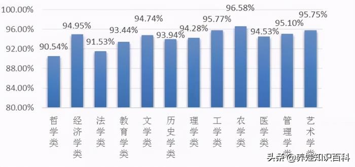 另外,通过对本科毕业生就业情况的统计,在就业比较高的专业里,金融相关的专业所隶属的经济学专业成绩也是不错的。虽然不是最高的,但是也达到94.95%。
