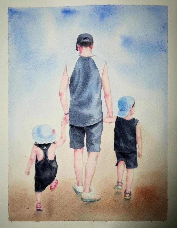 还有乔振宇、王倩一分别与孩子们的画像,乔振宇左右手分别拉着两个小宝贝,三人行露出背影,看着是那样美好,父爱尽显无疑。