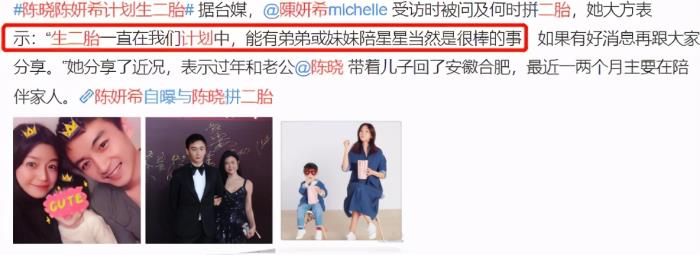 之前三月份台媒采访陈妍希,她还透露了二胎计划,她表示春节的时候和陈晓一起去安徽合肥陪儿子的爷爷奶奶过年,后面都在陪男方家人,一家人相处很融洽,二胎的事情一直都在计划中,能有弟弟或者妹妹陪星星是很棒的事情,有好消息会和大家分享。